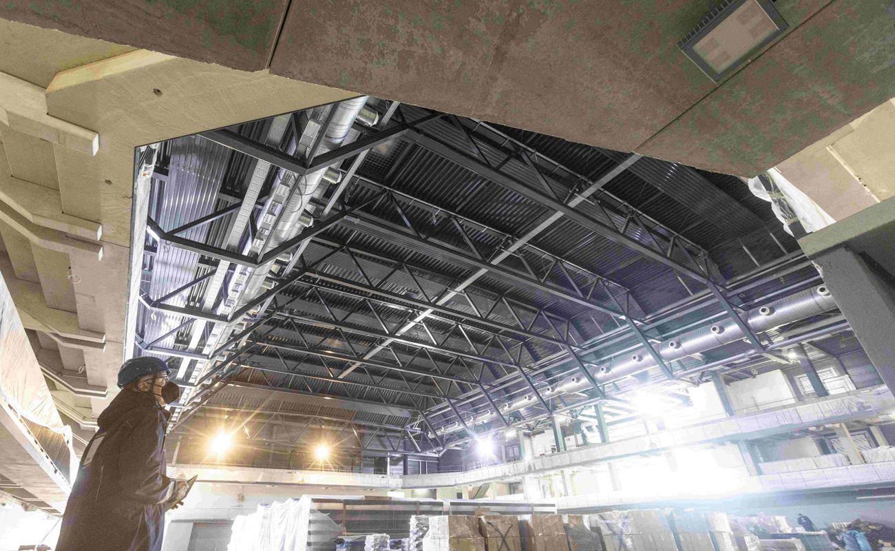 Alle drei Etagen der Halle sind bereits begehbar, ein Blick von den Rängen auf das künftige Spielfeld und ins Halleninnere verspricht stimmungsvolle Erlebnisse – ob Kultur oder Spitzensport.