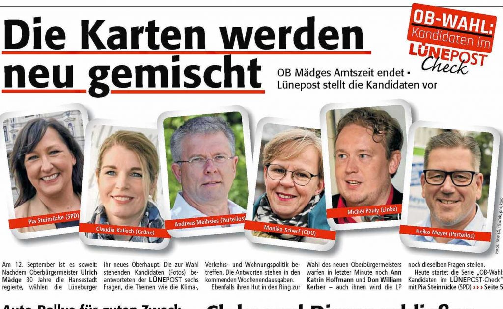 Lüneburg. Am 12. September ist es soweit: Nachdem Oberbürgermeister Ulrich Mädge 30 Jahre die Hansestadt regierte, wählen die Lüneburger ihr neues Oberhaupt. Die zur Wahl stehenden Kandidaten Pia Steinrücke (SPD), Claudia Kalisch (Grüne), Andreas Meihsies (Parteilos), Monika Scherf (CDU), Michèl Pauly (Linke) und Heiko Meyer (Parteilos) beantworteten der Lünepost sechs Fragen, die Themen wie die […]