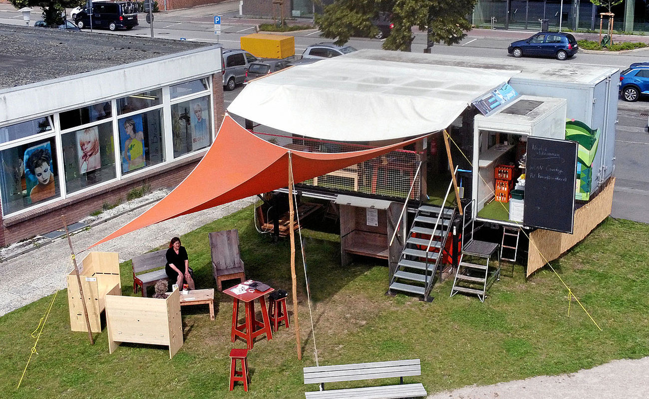 Auf dem freien Platz in der Berliner Straße in Lauenburg ist gegenüber von Edeka richtig was los: Am bunten Container mit Terrasse und Kaffeeküche locken Veranstaltungen Bürger und Touristen an.