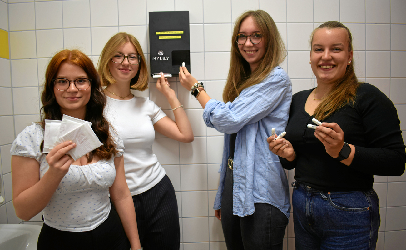 Scharnebeck. Ältere Mädchen und jüngere Frauen kennen diese Situation: Sie sitzen im Unterricht und mit einem Mal kommen völlig überraschend die Tage. „Bisher sind unsere Mitschülerinnen in solchen Momenten ins Sekretariat gegangen, um dort Hygieneprodukte zu holen. Doch nicht alle wussten, dass es dort überhaupt welche gibt“, weiß Schülerin Sofia Meyer aus Scharnebeck. „Für andere war die Situation auch unangenehm“, ergänzt Mitschülerin Clara Oppermann. Beide sind in Jahrgang 13 am Bernhard-Riemann-Gymnasium. Mit den Mitschülerinnen Mia Mathes und Jil Hansmann haben sie für Abhilfe gesorgt. Sie organisierten Spender mit Binden und Tampons auf zwei Mädchentoiletten in der Schule.